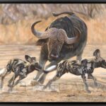 This Cape Buffalo is exhausted, tired by the relentless attacks of wild dogs, these wild dogs that hunt in packs. He is certainly stronger but, surrounded by the “painted wolves”, he will get tired until he can no longer stand, until he no longer struggles. In the meantime, he must not surrender.