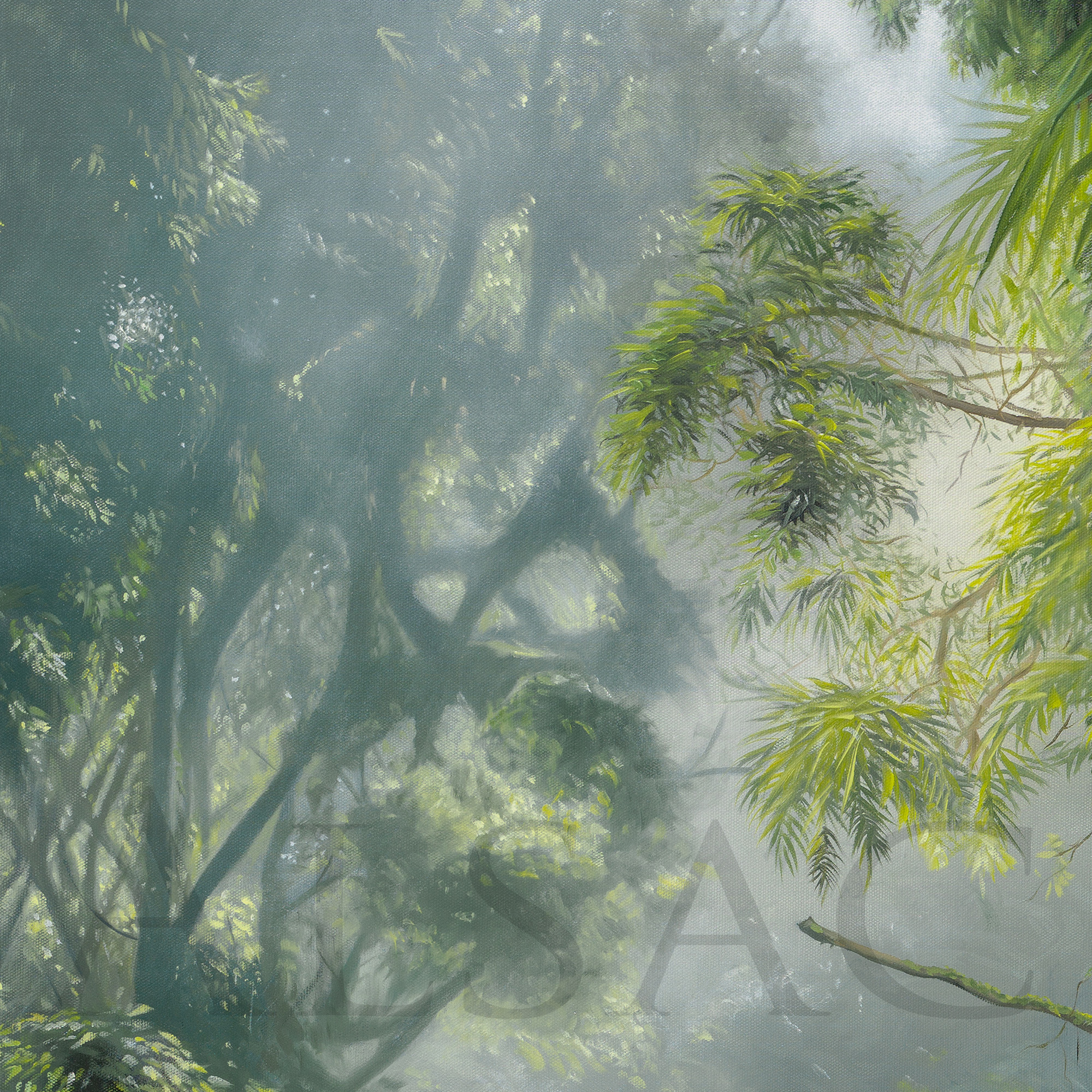 In “The Sanctum,” my artistic vision was to create a scene where the jungle becomes a timeless sanctuary, a sacred place, beyond the destructive reach of humankind. The gorilla, majestic and powerful, stands as a guardian, the silent protector of this untouched, preserved space. It symbolizes the strength and ancient wisdom of nature, embodying the role of a guardian of the secrets and mysteries buried deep within the forest. This painting invites the viewer to connect with nature in all its wild splendor and to recognize both the beauty and fragility of this endangered world.