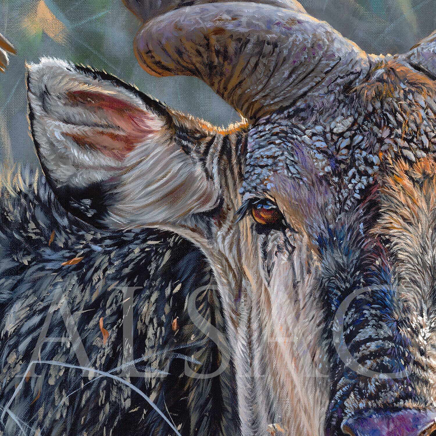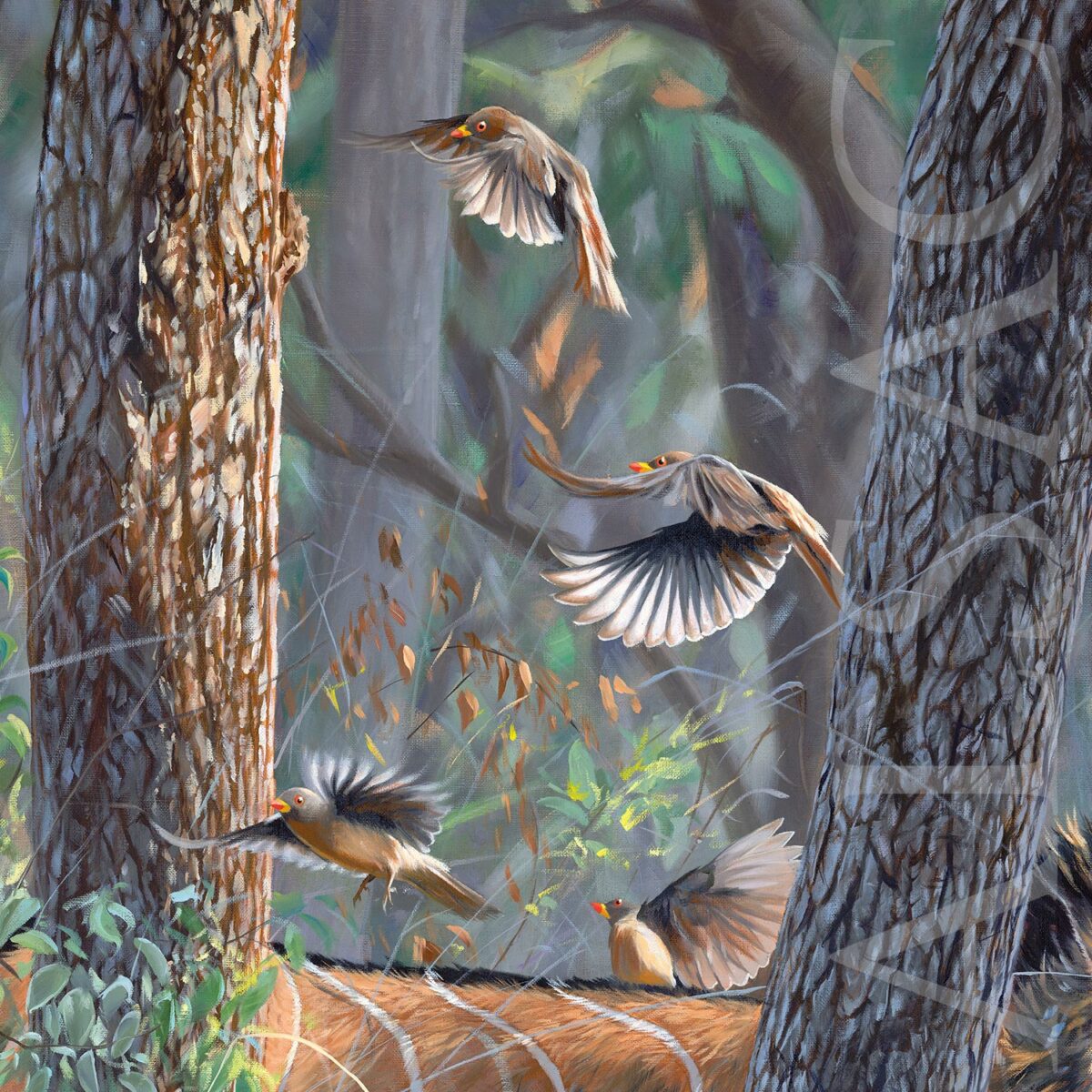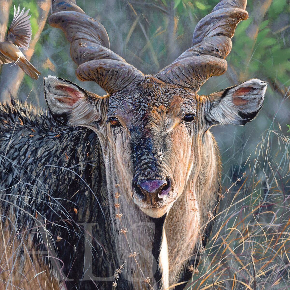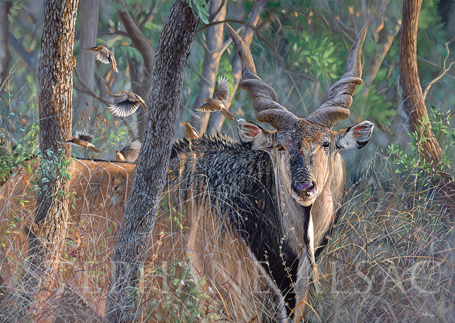 In the end, I wanted to immortalize in this painting first of all the fleeting vision of this elegant Giant seen between the trees of a very wooded savannah. Then, I tried to transcribe the atmosphere of the end of the day, at the end of an exhausting day of hunting, a moment of unreal magic. Finally, I hope that this painting conveys the excitement and the emotion that were mine at this intense moment when I met The “Lord Derby Eland”.