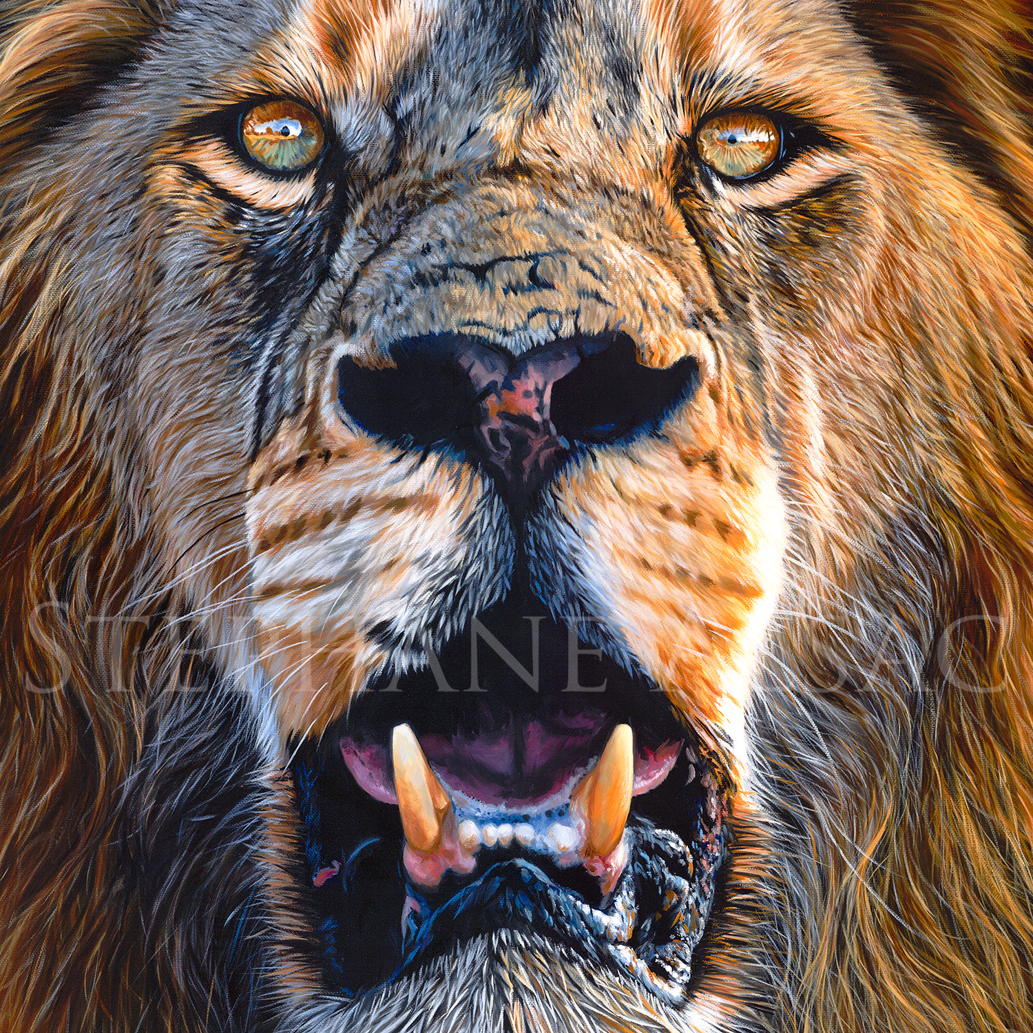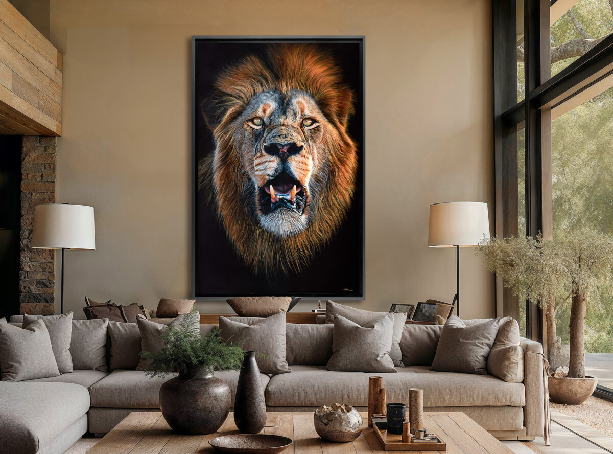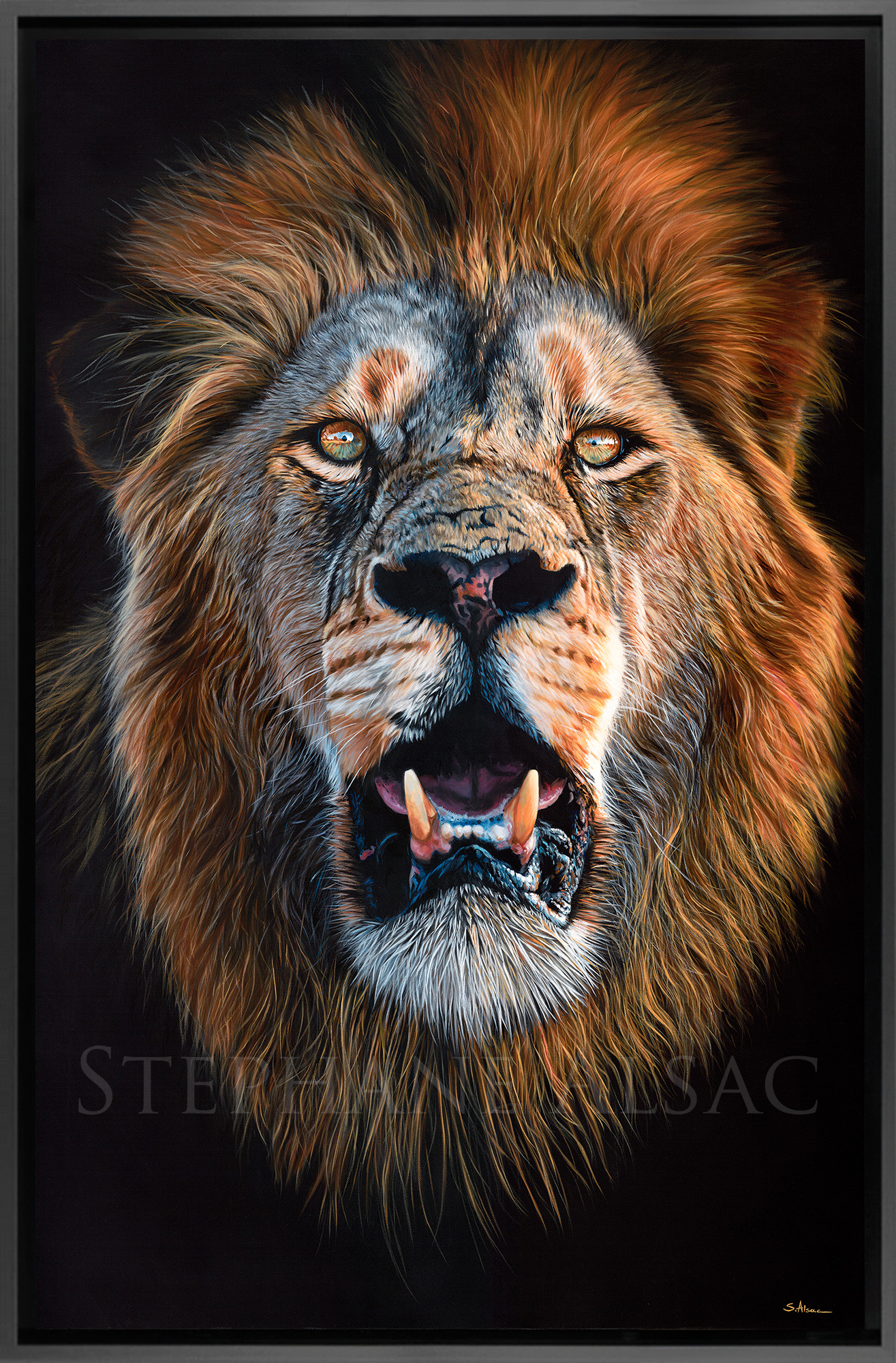 I want to give my representation of the lion in all its majesty and savagery. The image of the ultimate predator, it must be both beautiful and menacing. We find this duality in the opposition of warm tones and cold tones.The composition is raw, essential: portrait, without embellishment in chiaroscuro. The gaze is piercing, you have to get lost in it and not be able to get out.