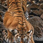Tigers live alone and aggressively scent-mark large territories to keep their rivals away. They are powerful nocturnal hunters that travel many miles to find buffalo, deer, wild pigs, and other large mammals. Tigers use their distinctive coats as camouflage (no two have exactly the same stripes). They lie in wait and creep close enough to attack their victims with a quick spring and a fatal pounce.