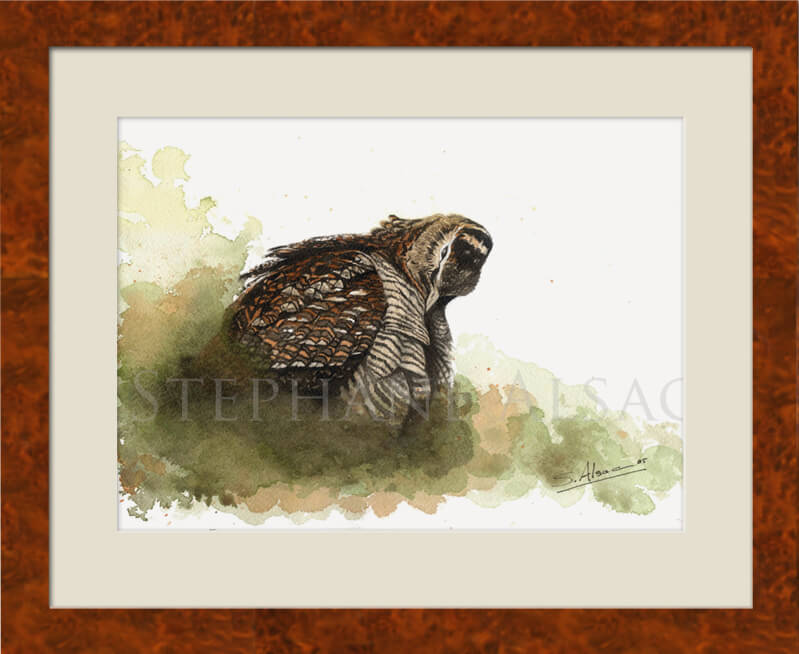 Digital lithogrph on paper of the original watercolor painting by Stephan Alsac, contemporary animal artist: the painting of a woodcock.