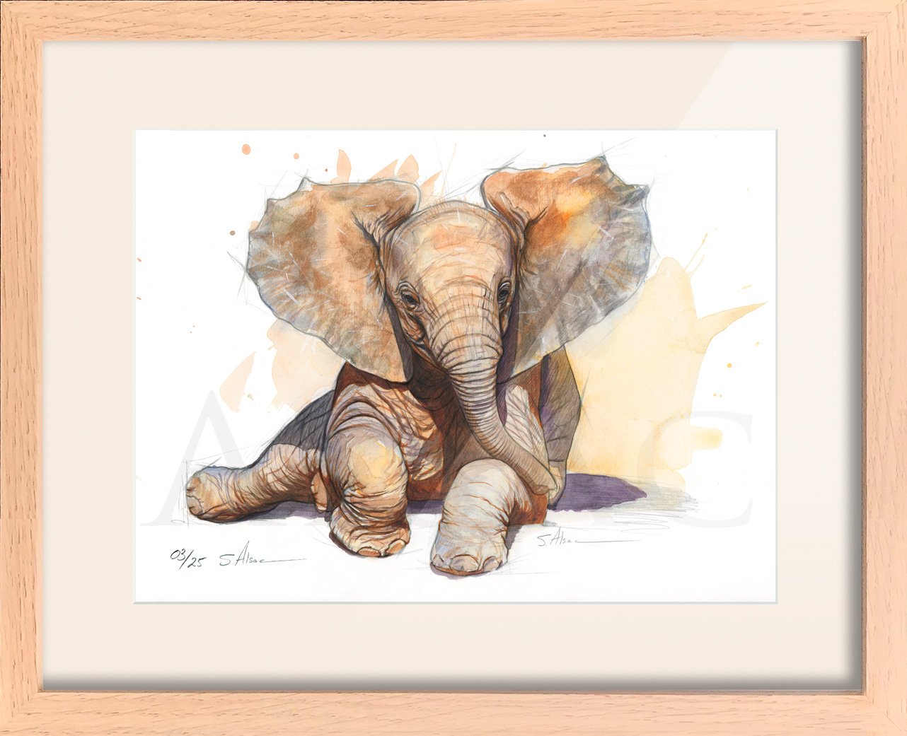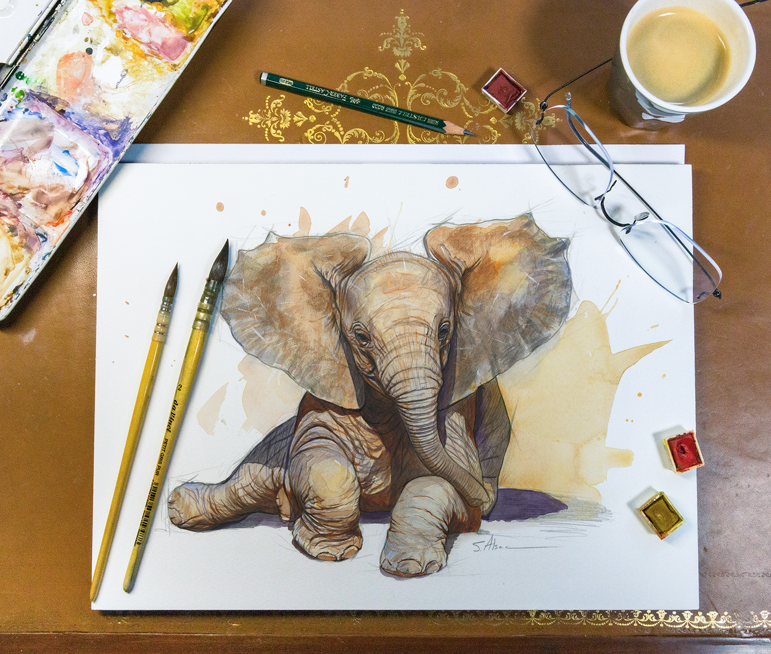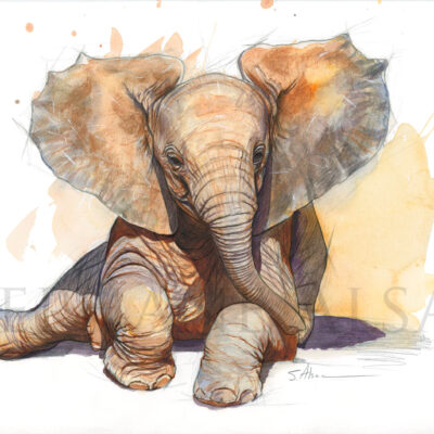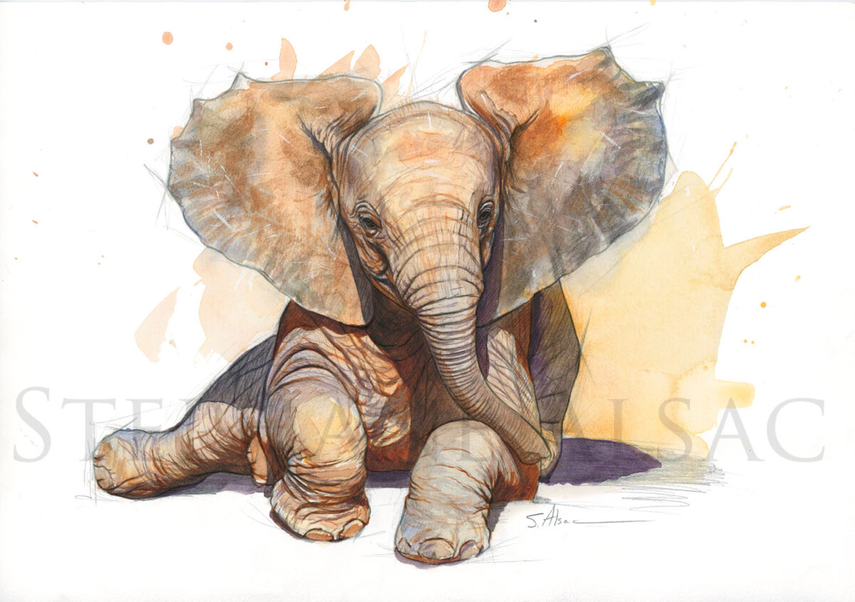 Original illustration in watercolor by Stephan Alsac, contemporary animal artist: A baby elephant made with charcoal and enhanced with watercolor.