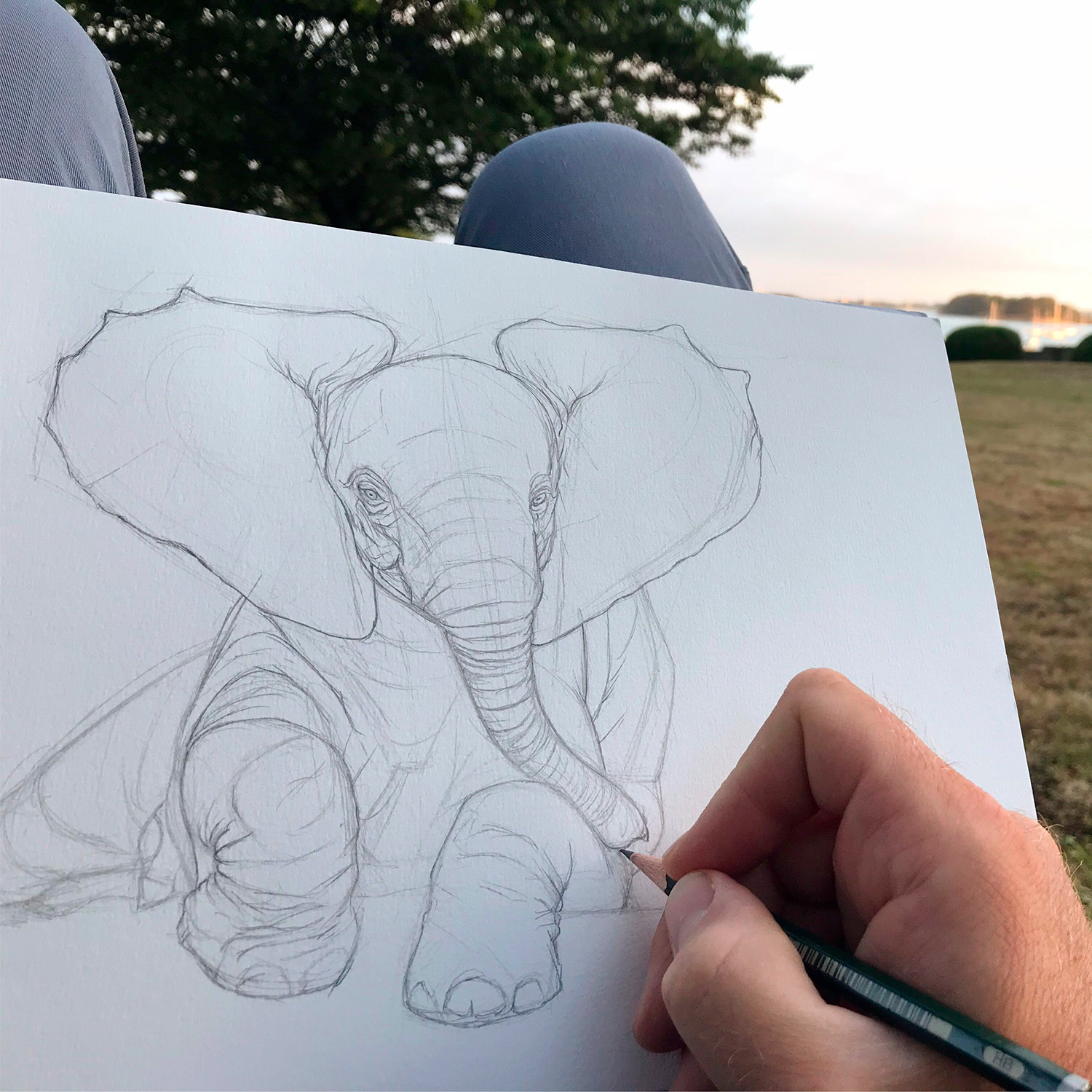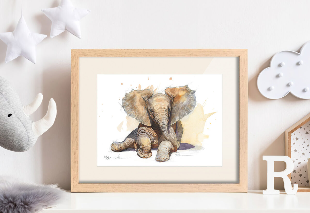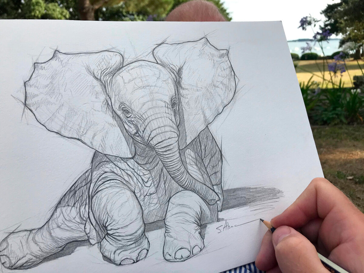 Original illustration in watercolor by Stephan Alsac, contemporary animal artist: A baby elephant made with charcoal and enhanced with watercolor.