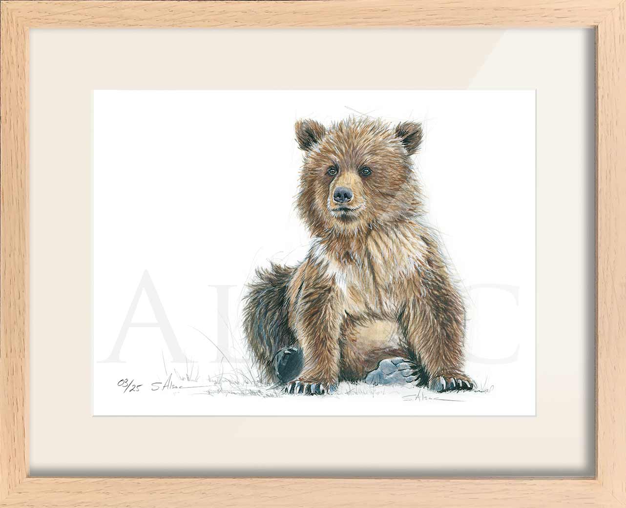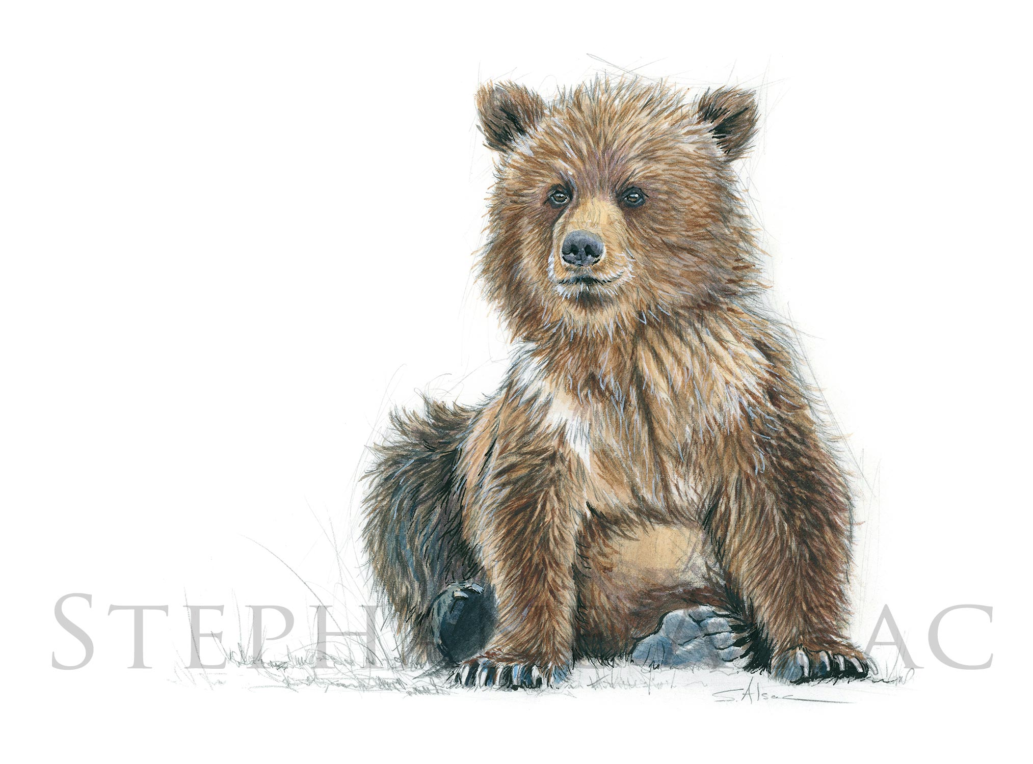 Original illustration in watercolor by Stephan Alsac, contemporary animal artist: A baby bear made with charcoal and enhanced with watercolor.