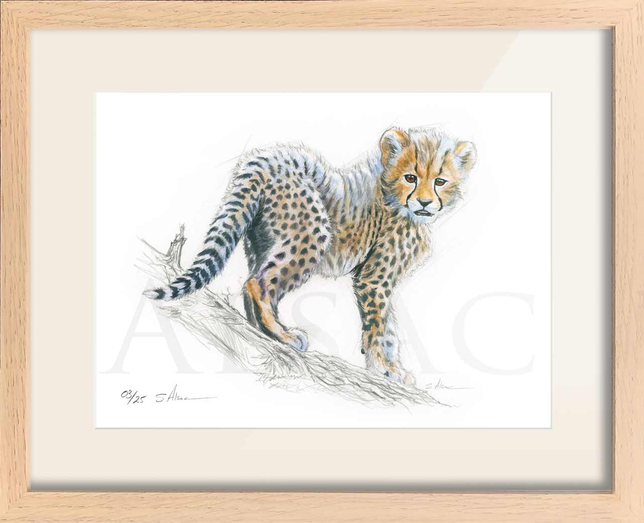 Original illustration in watercolor by Stephan Alsac, contemporary animal artist: A baby cheetah made with charcoal and enhanced with watercolor.