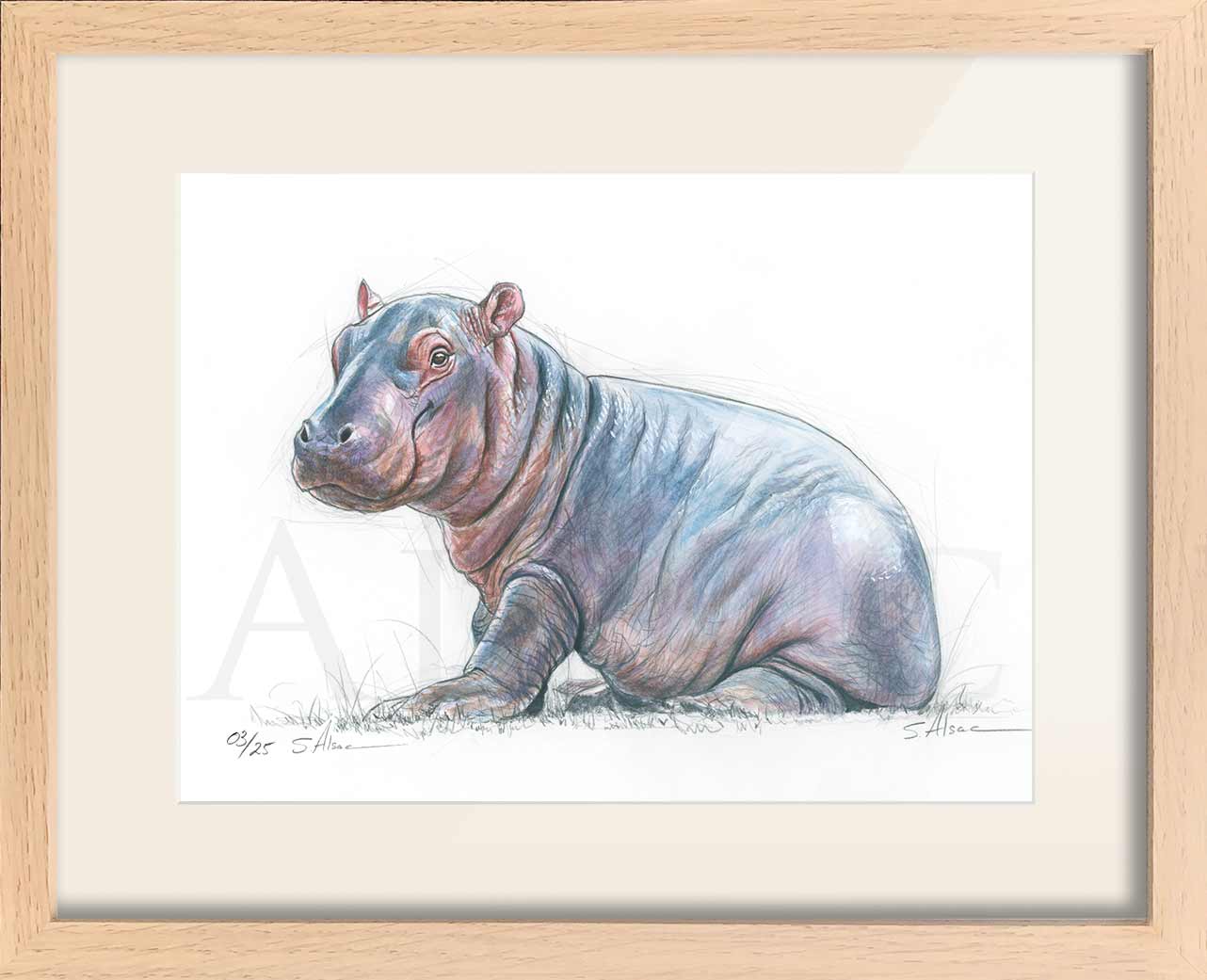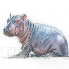 Original illustration in watercolor by Stephan Alsac, contemporary animal artist: A baby hippo made with charcoal and enhanced with watercolor.