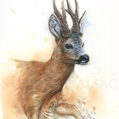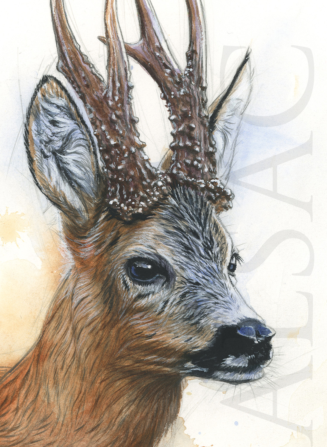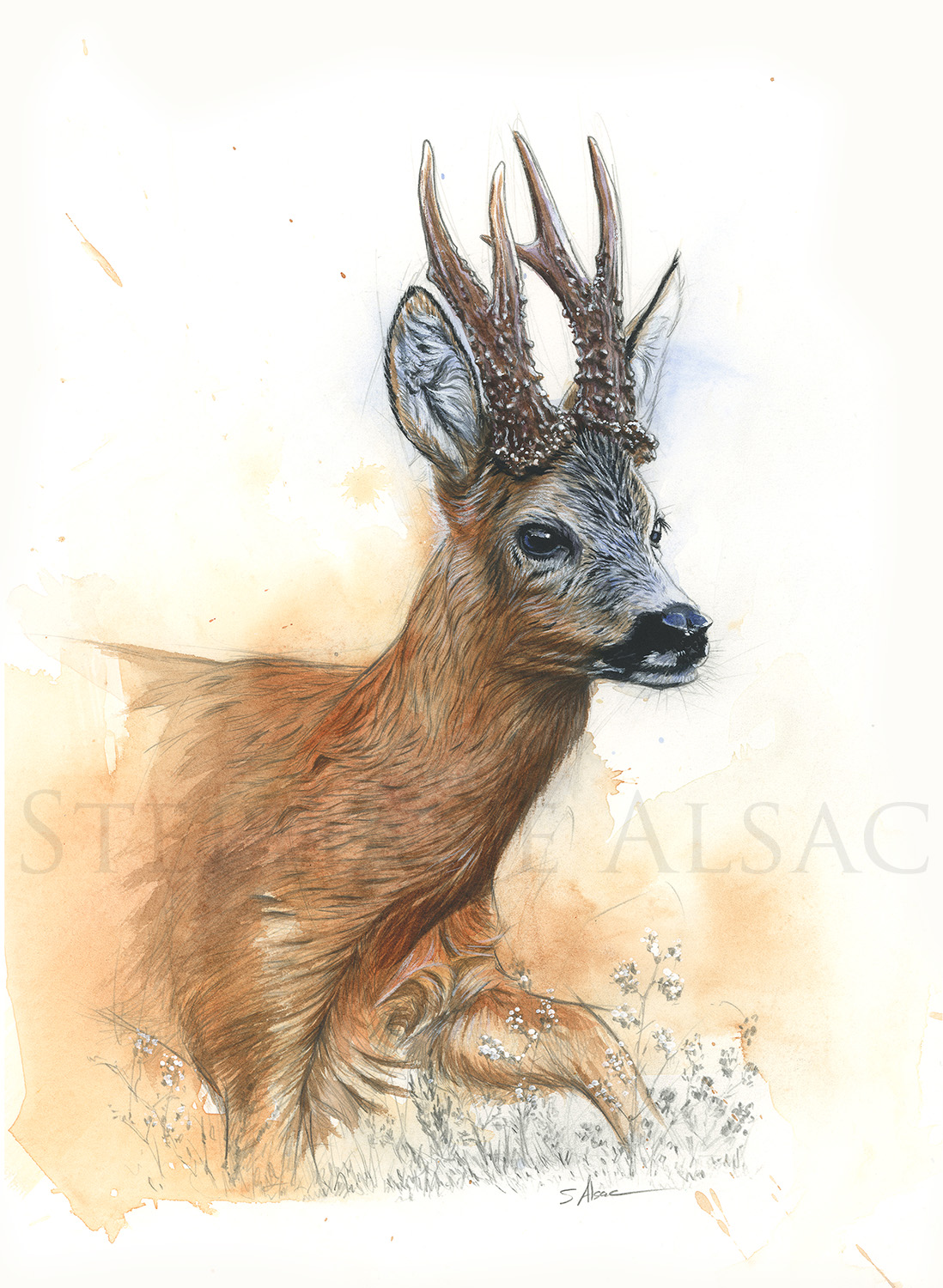 Original illustration by Stephan Alsac, animal artist: the portrait of a Roe Buck carrying a beautiful trophy done in pencil and watercolor