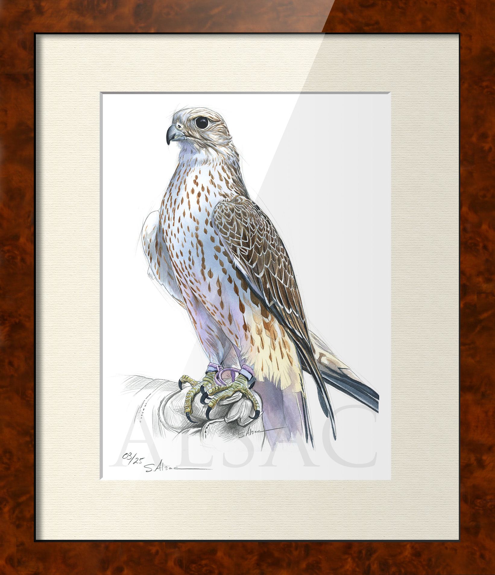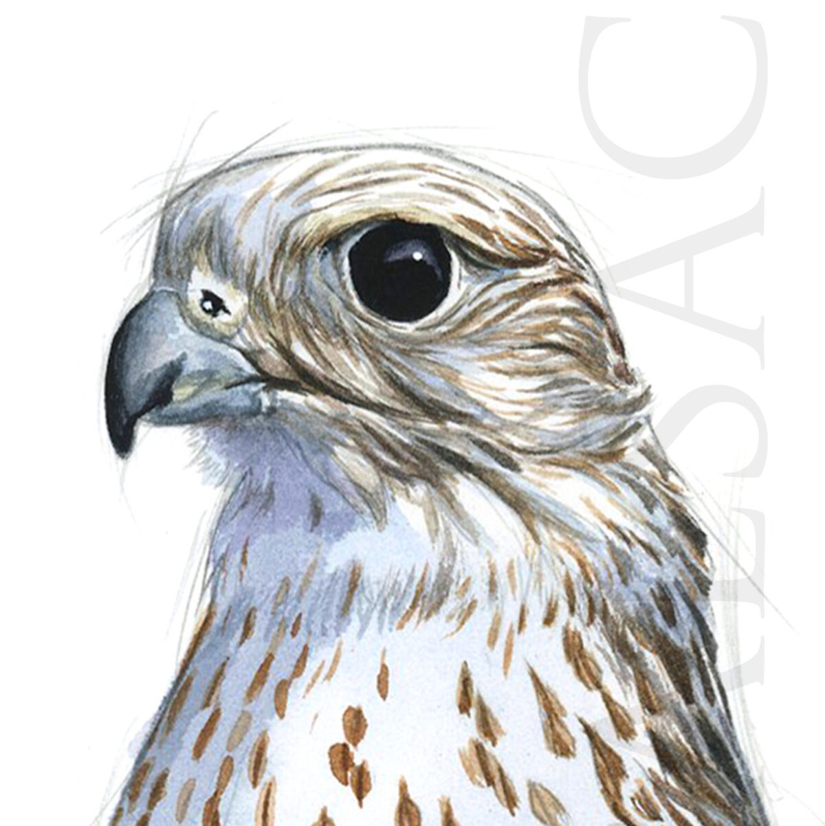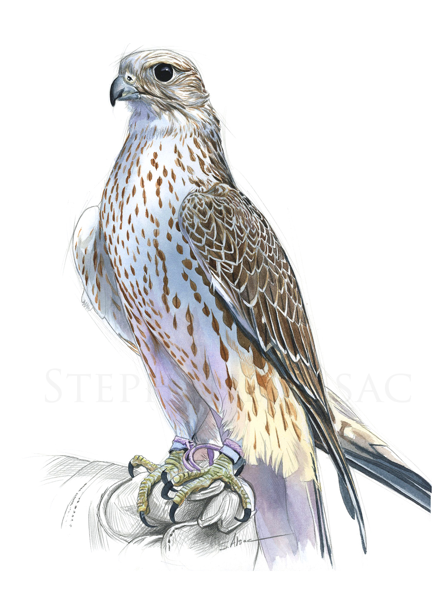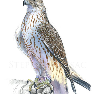 Original illustration created by Stéphan Alsac, animal artist: the drawing of a saker falcon made in graphite and enhanced with watercolor