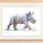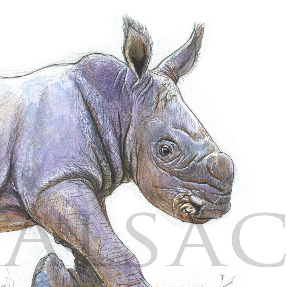 Original illustration in watercolor by Stephan Alsac, contemporary animal artist: A baby African white rhinoceros made with pencil and enhanced with watercolor.