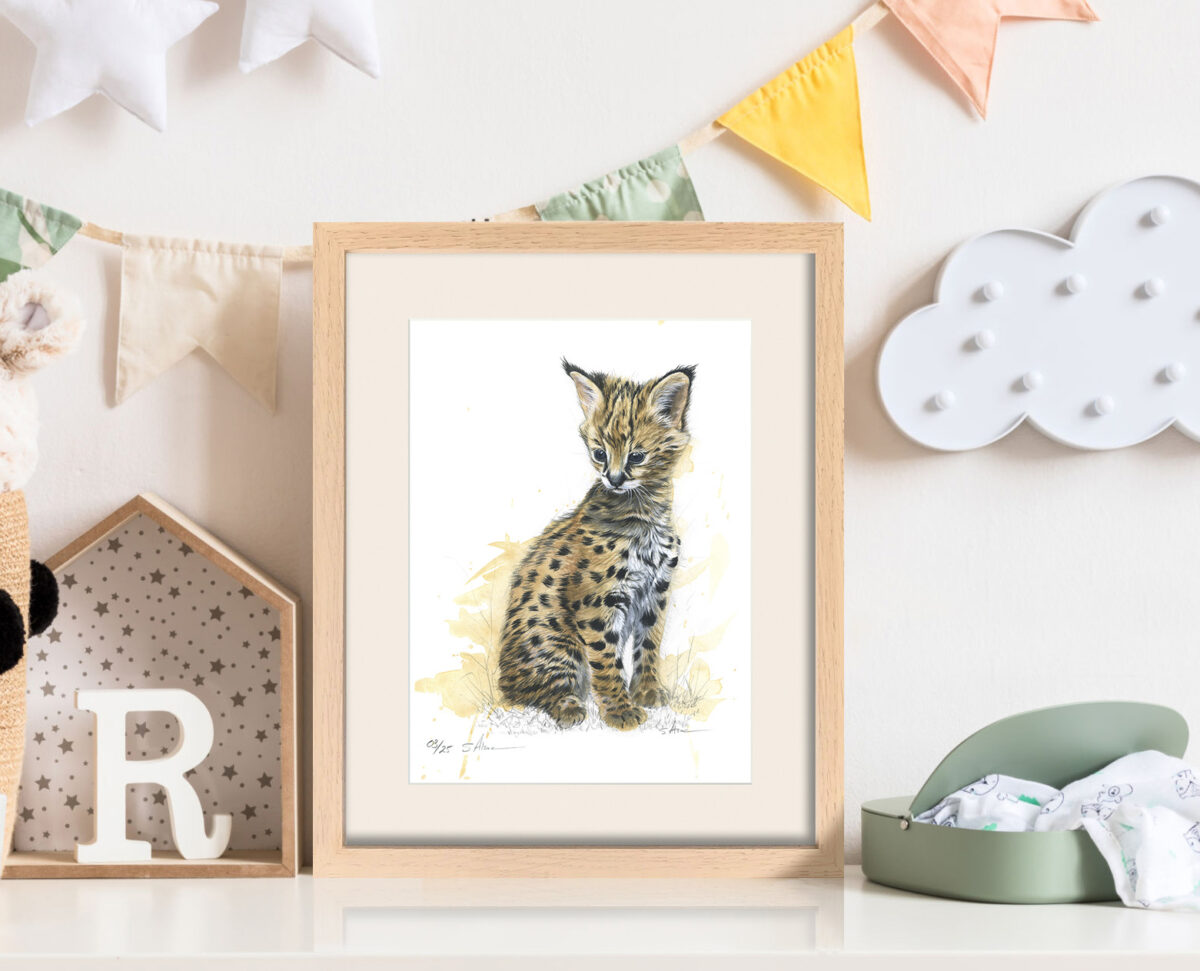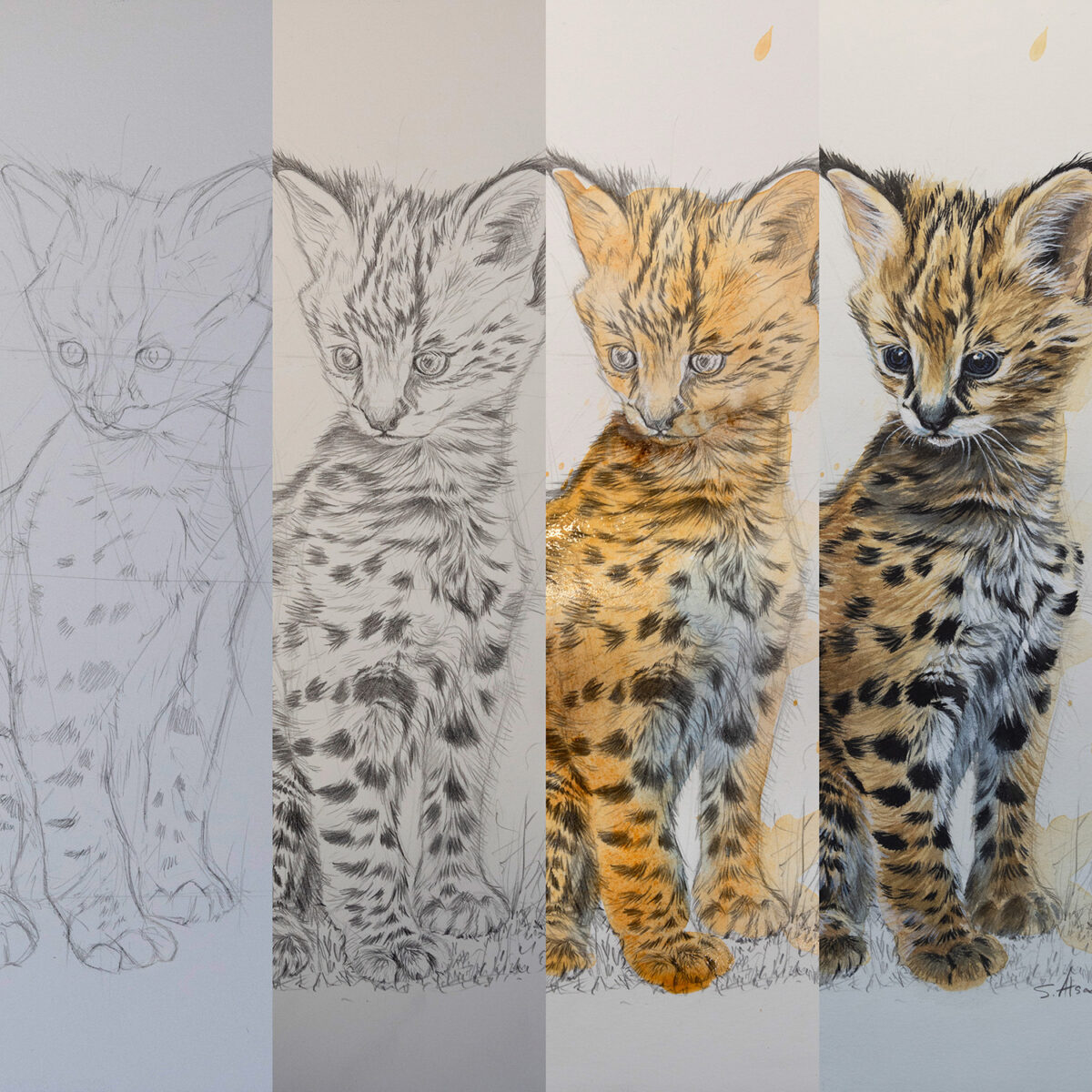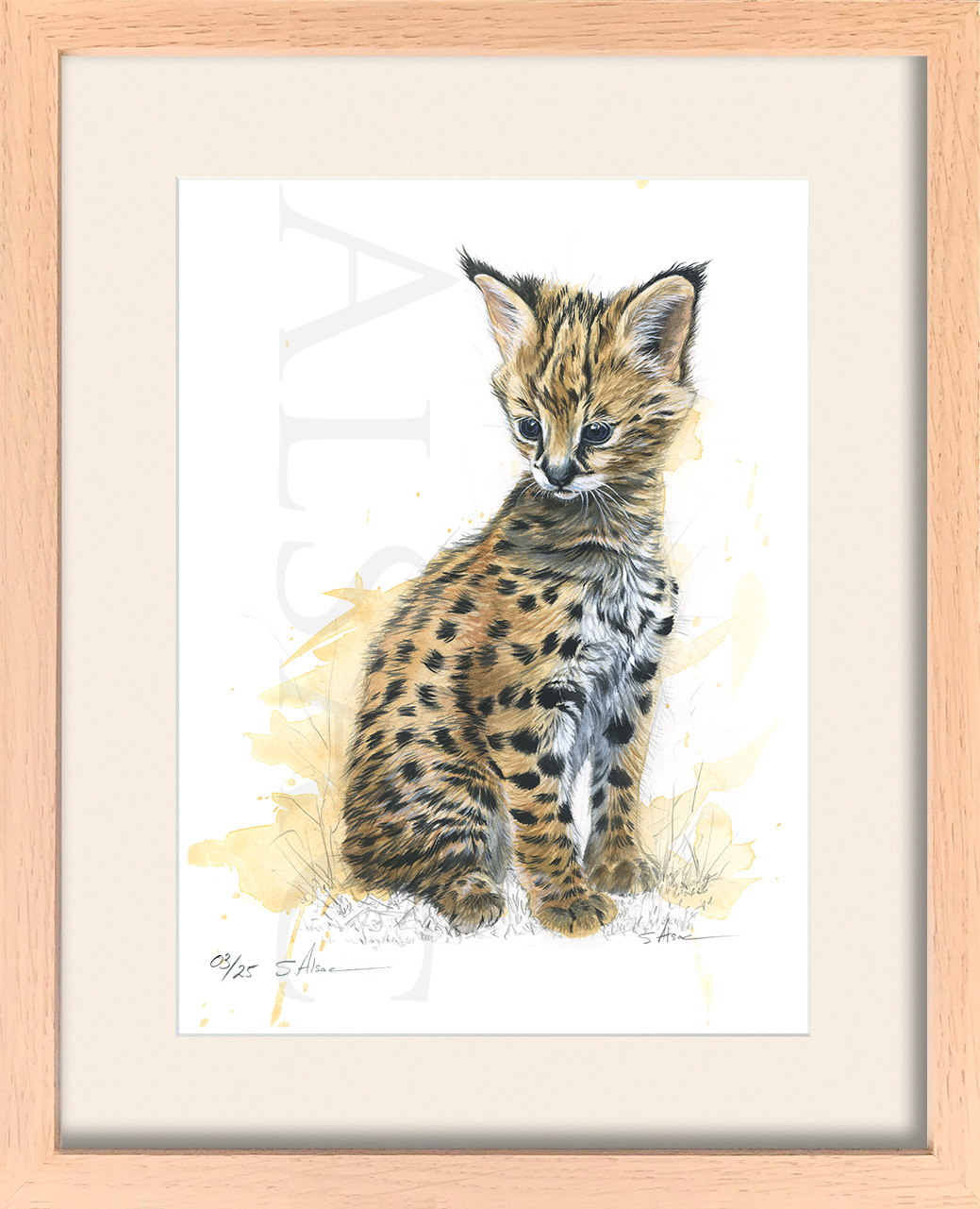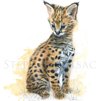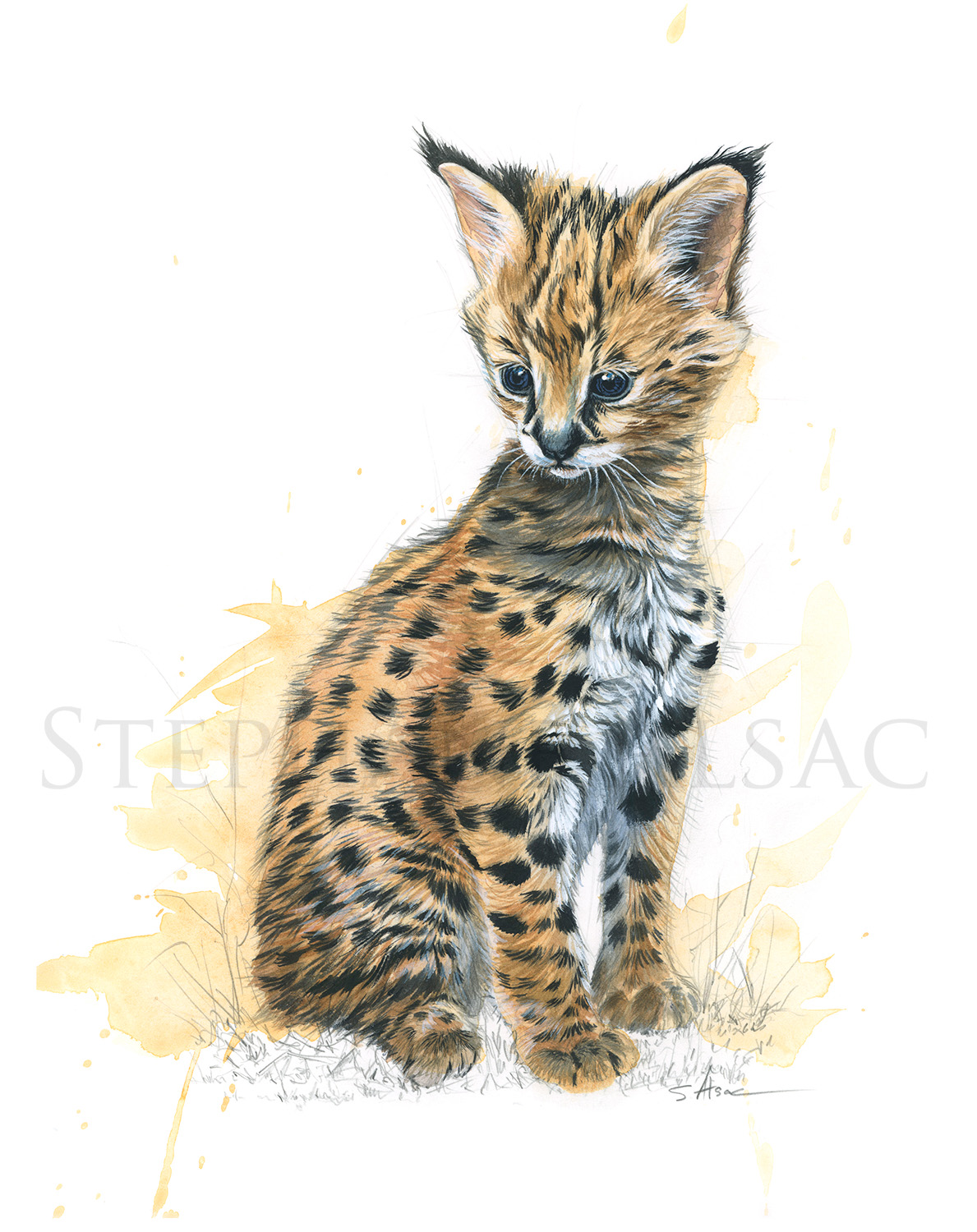 Original illustration in watercolor by Stephan Alsac, contemporary animal artist: A baby serval made with charcoal and enhanced with watercolor.