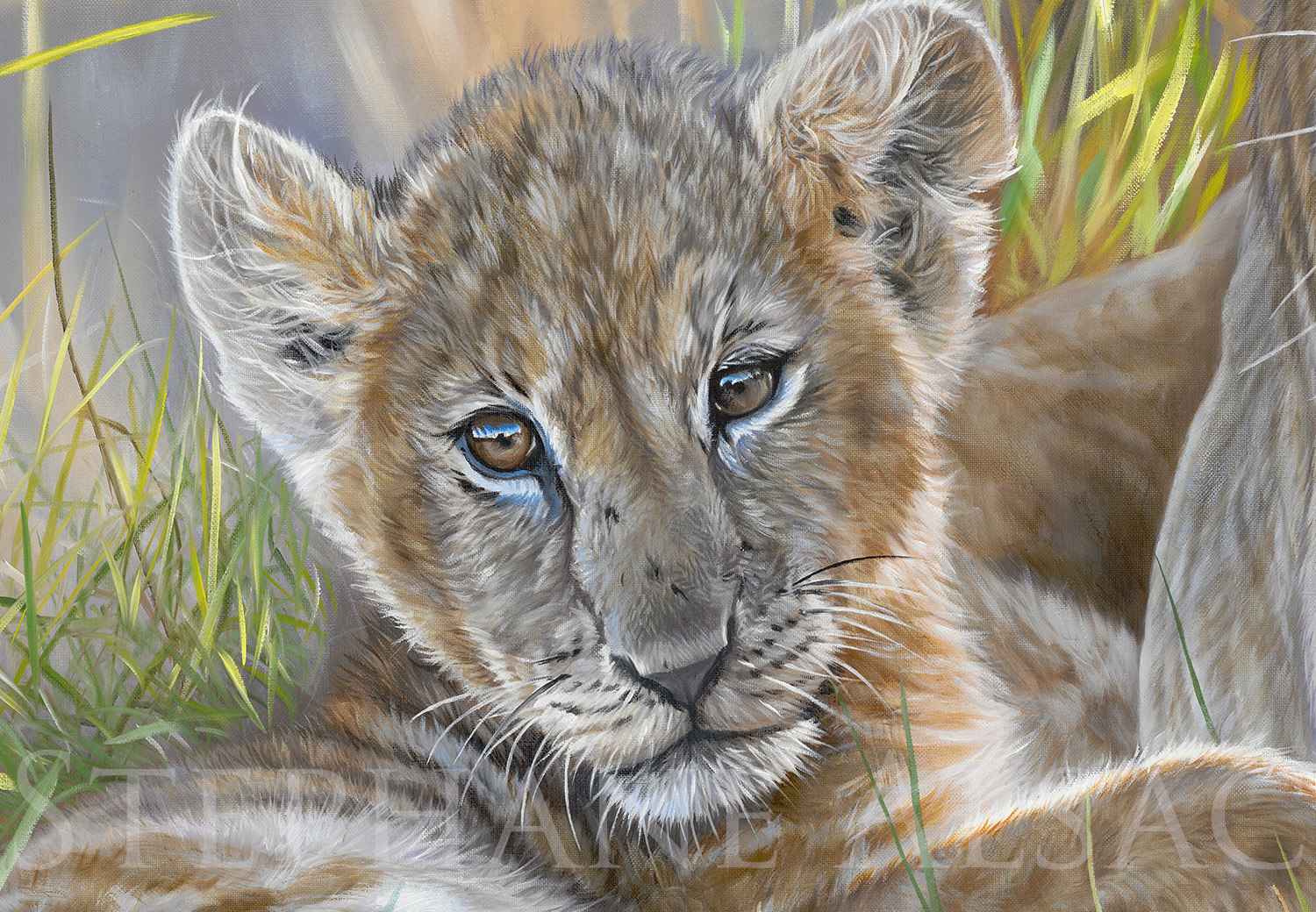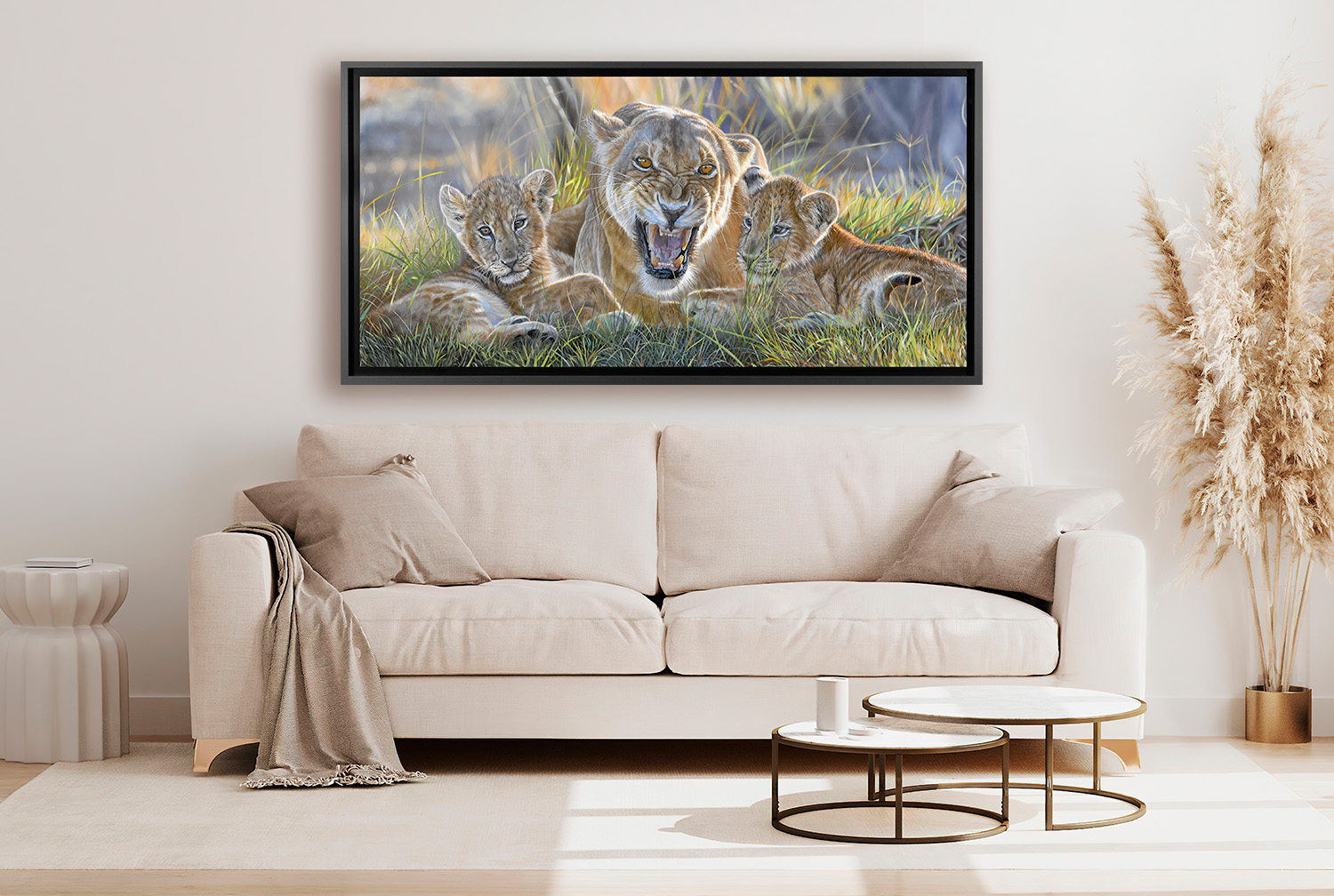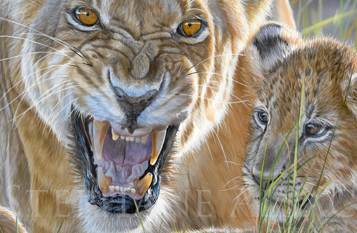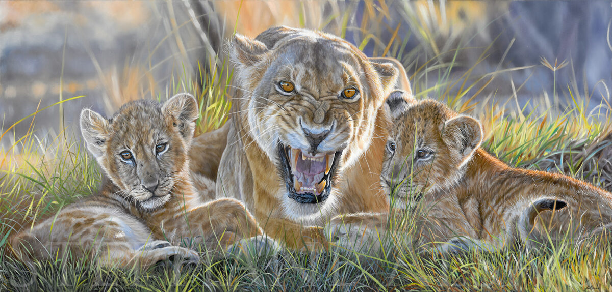 “Fiercely Protective” – Oil painting – Lioness protecting her cubs
