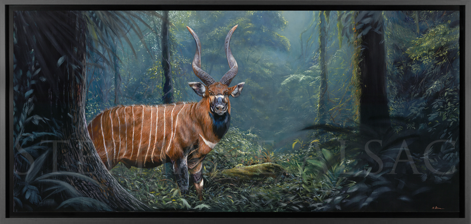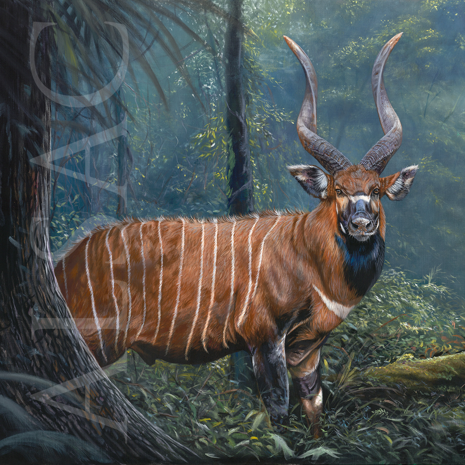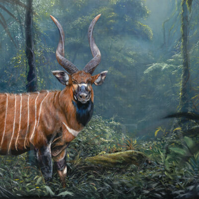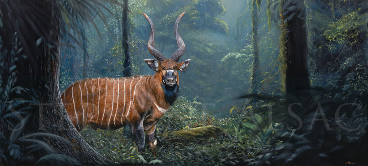 In the end, what I wanted to convey in this painting was this incredible experience. The painting’s main subject is not so much the Bongo as the forest that draws you into its maze of elephant tracks. The composition directs the viewer’s eye, the mystery takes you away, you’re in the painting, and the only escape is this source of light.