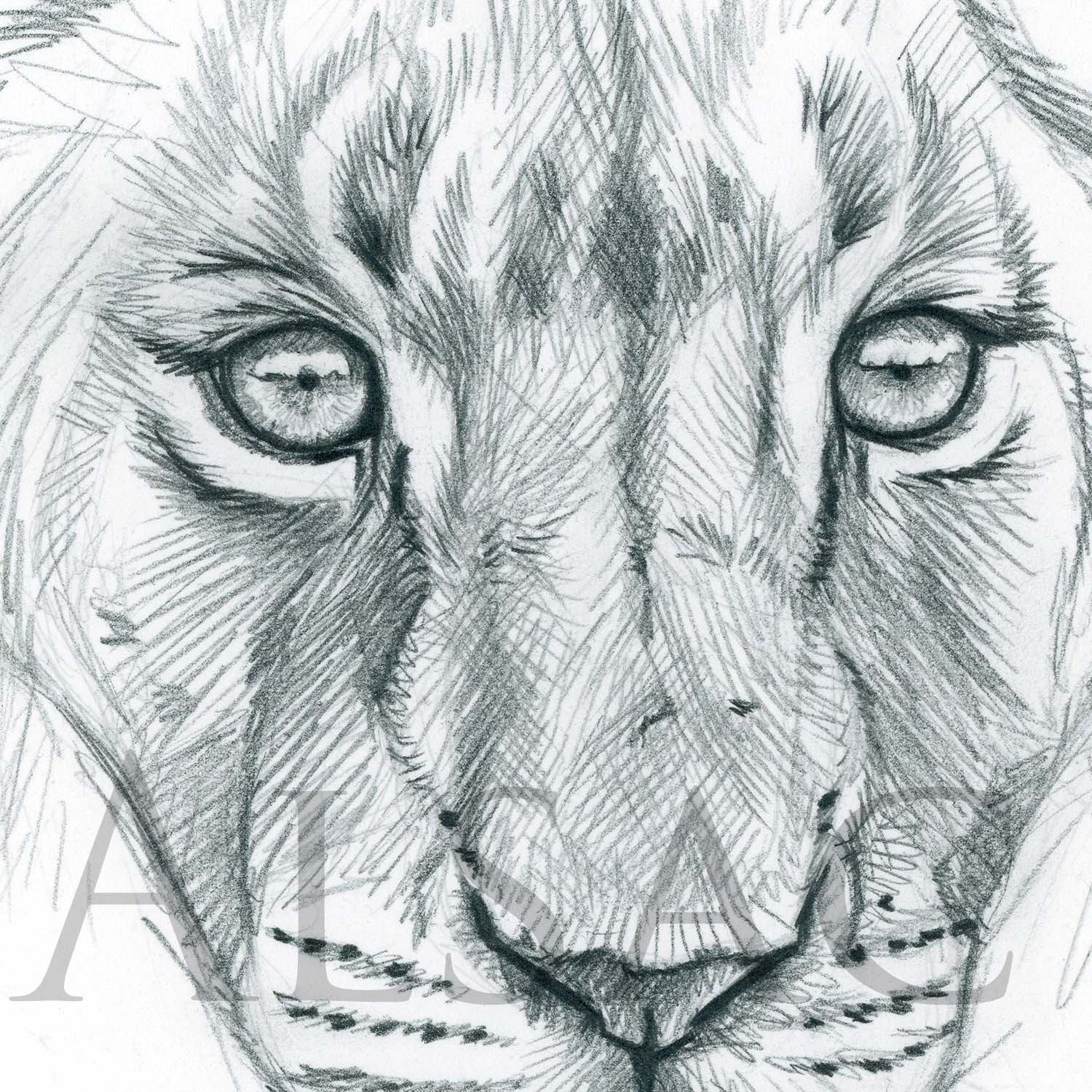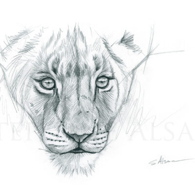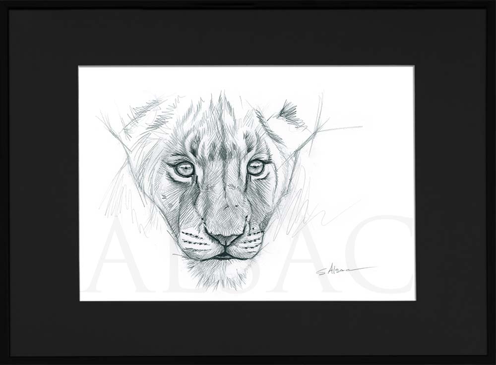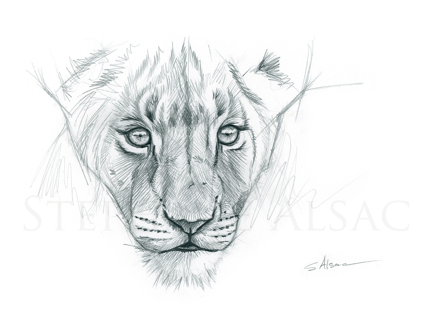 Original wildlife artwork drawn by Stéphane Alsac, contemporary wildlife artist : A black & white realistic drawing of a lion cub.