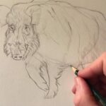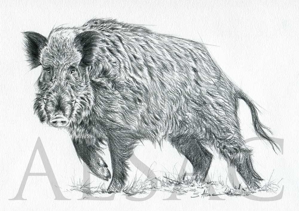 Original artwork drawn by Stéphane Alsac, modern animal artist : A Wild Boar in charcoal drawing.