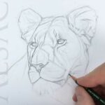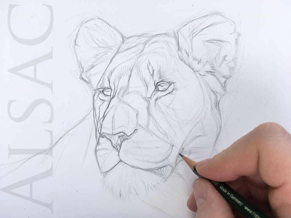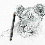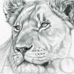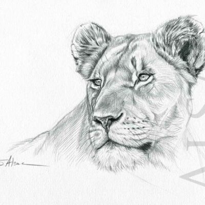 Original artwork drawn by Stéphane Alsac, modern animal artist : A black & white realistic drawing of a Lioness – Graphite on Paper