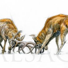 Original watercolor painting by Stéphane Alsac, contemporary wildlife artist  : A drawing of a fight of two deers