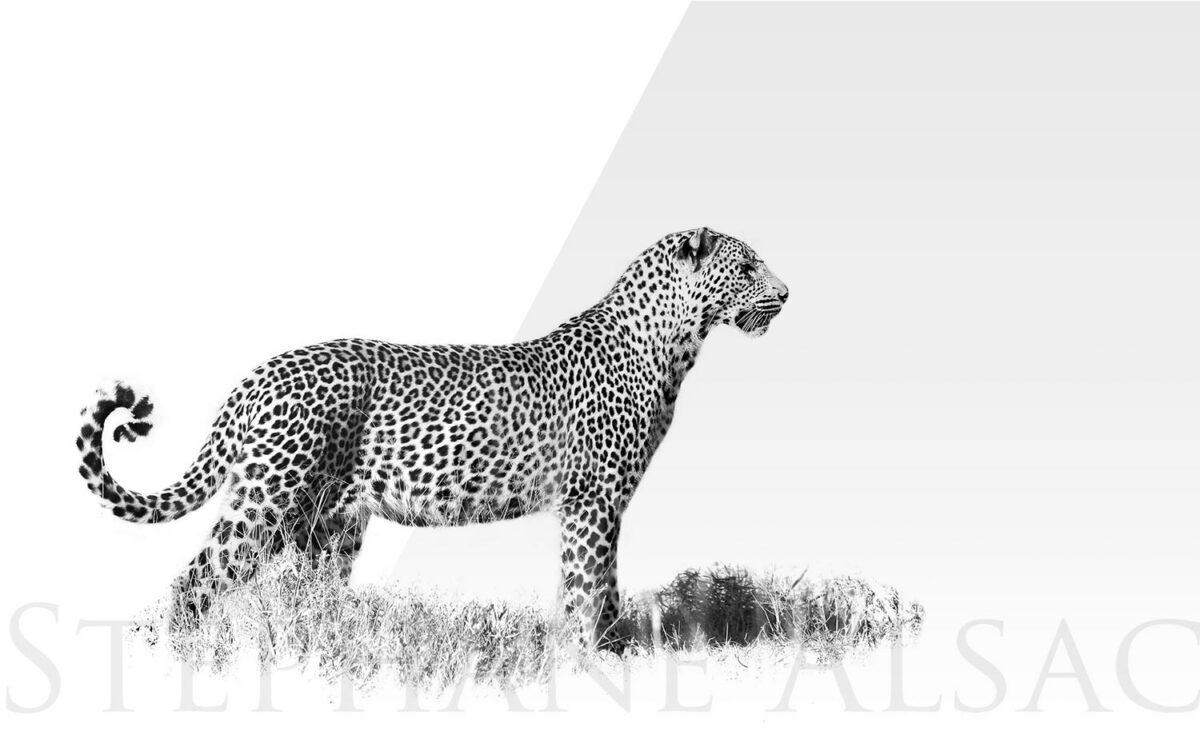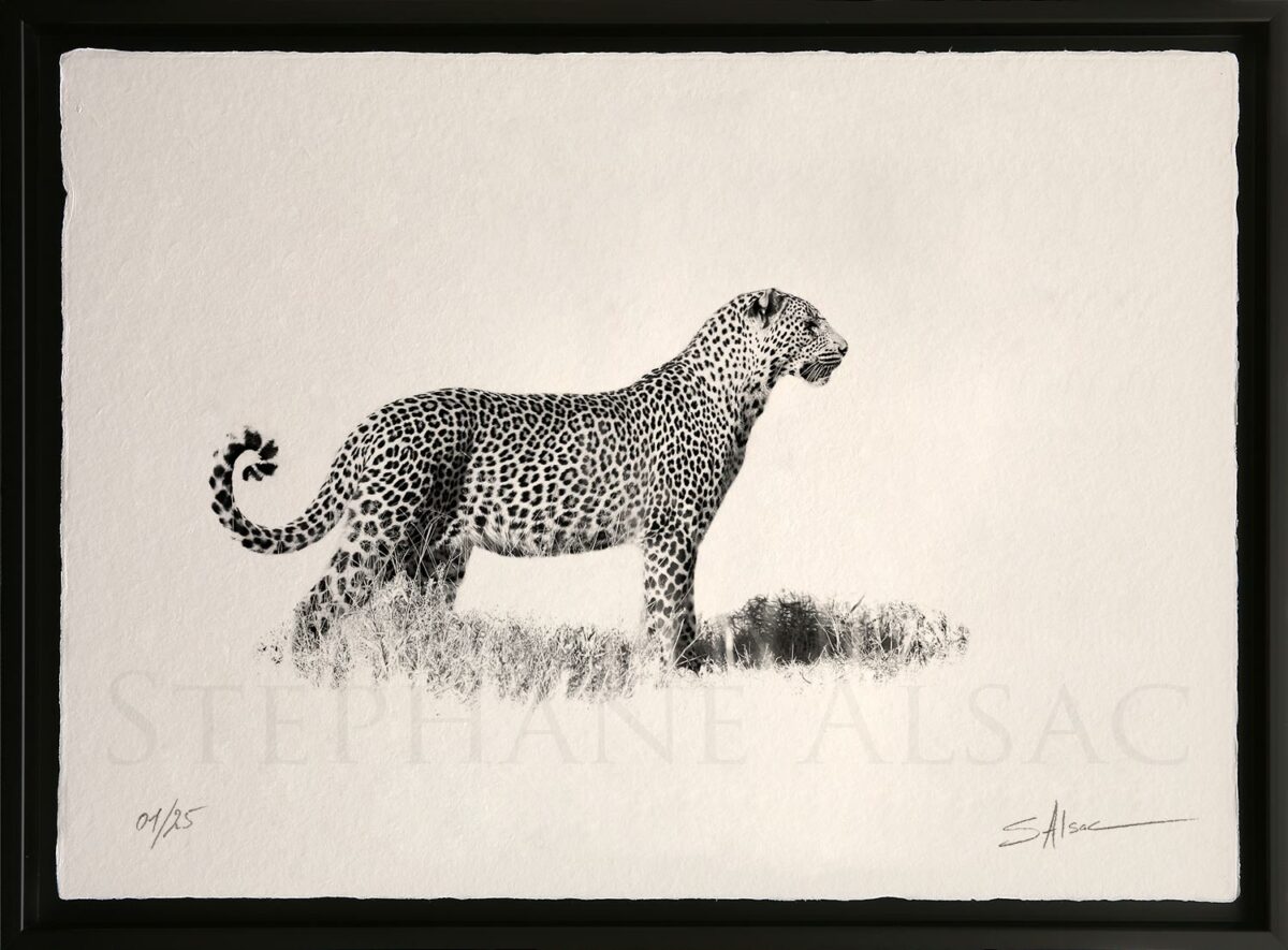 “Wild Beauty” is a series of Black and White Art Photographs by Animal Artist Stéphane Alsac, known for his strikingly realistic paintings of animals. The artistic intention of this collection of monochrome photos is to create a dialogue between the African wild animal and the viewer. The black and white photo brings out the shapes and textures of African animals and thus emphasizes the raw strength of the animal and its wild beauty. Stéphane Alsac invites you to plunge your eyes into those of the Lion, to touch the texture of the Elephant’s trunk, to feel the leopard hiss through these artistic black and white and sepia photos. The atmosphere of the African savannah takes you on a magical photo safari. Original photographic prints are limited to 25 copies. The photo is signed by the wildlife photographer and numbered. Choose the size and look of your photo: