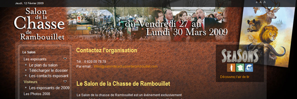 Comme chaque année, depuis maintenant 4 ans, je serais présent au Salon de la Chasse de Rambouillet 2009. Celui-ci se tiendra du Vendredi 27 au Lundi 30 mars 2009.