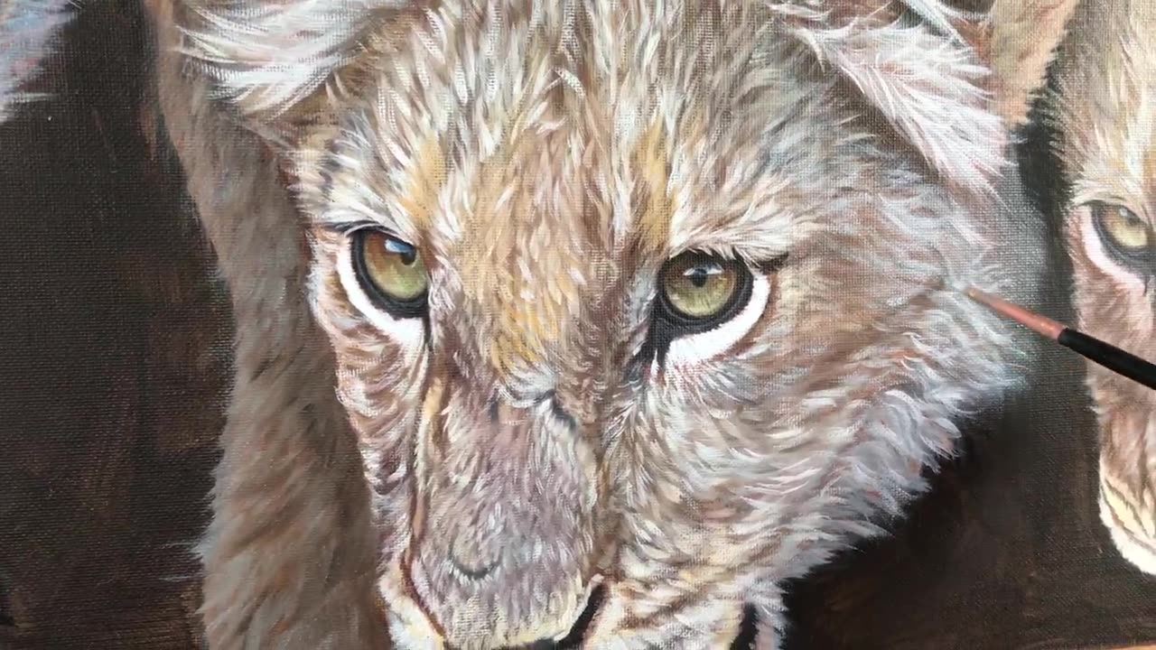 Un aperçu de ma toile en cours : 1,5m de long, 5 lionceaux et 2 lionnes.
