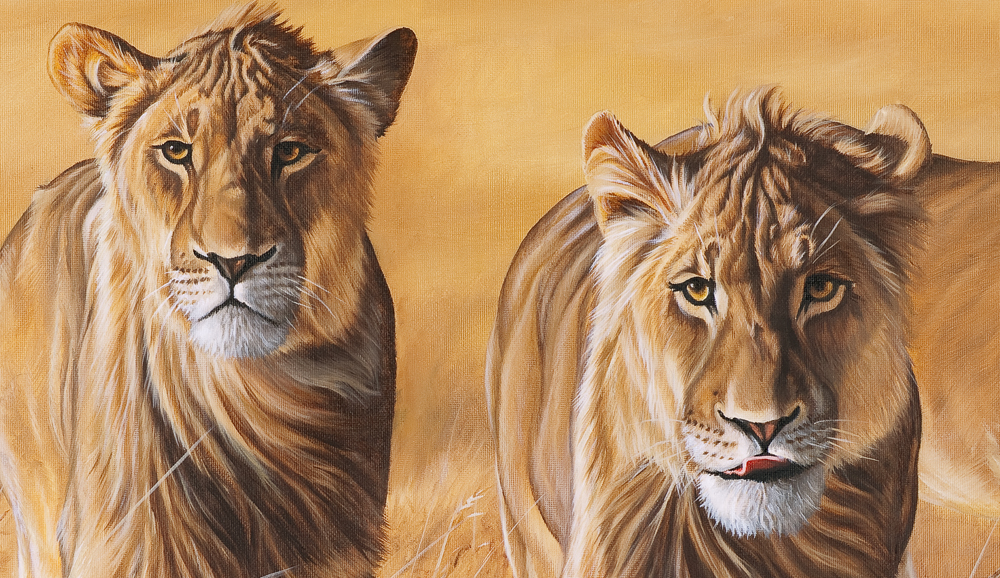 « A Painting is often the result of an encounter with someone or an animal. In this case, « The Wild Bunch », is an encounter with a anonymous stunning picture. It tooks me weeks to find its author and contact him to ask permission to draw inspiration from his picture. Despite the distance, we got acquainted and I was touched by his kindness and availability. He has met these young lions, but now, after three months working on this painting, I seem to have been there with him in South Africa »