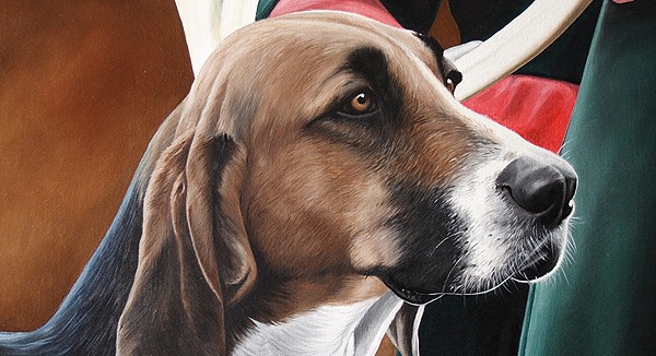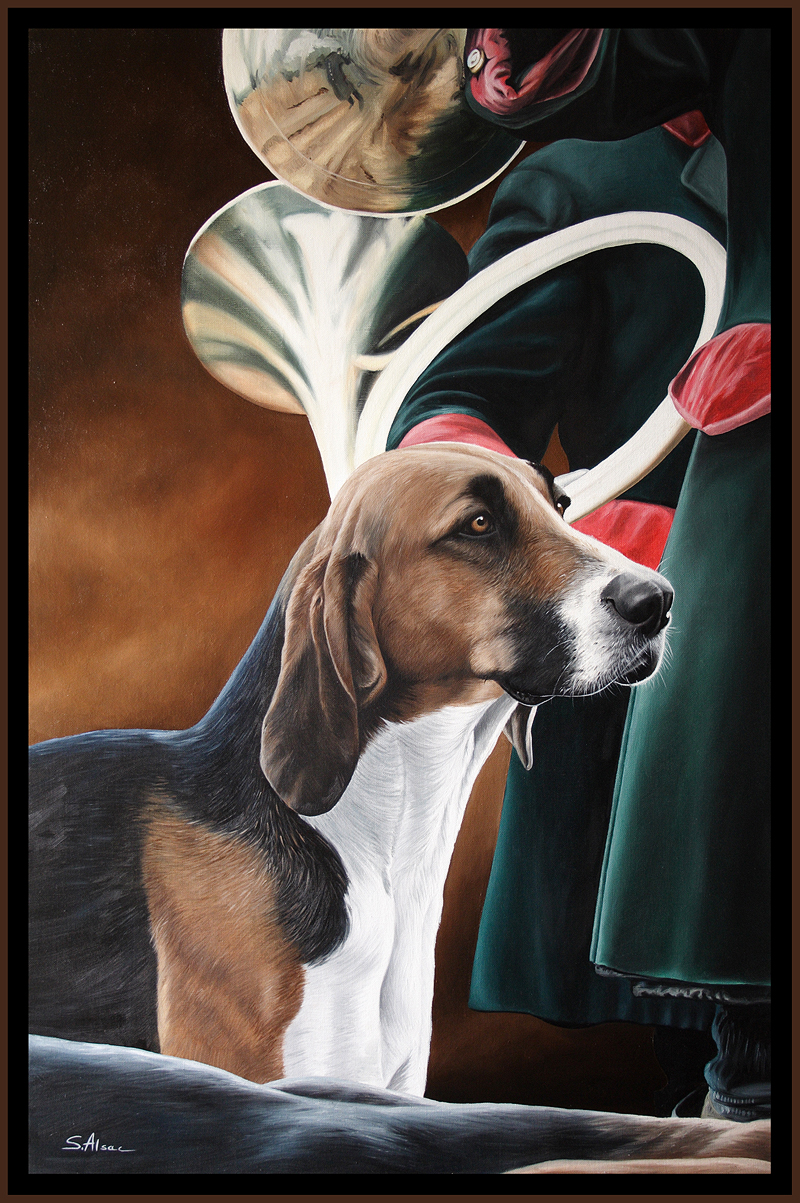» Big Up Canem ! est le fruit d’une rencontre avec un jeune photographe du nom d’Alexis Courraud. Je cherchais un sujet pour le Concours de Peinture organisé par la Société de Vénerie à l’occasion de ses 100 ans. Quoi d’autre qu’un chien et des trompes pour symboliser la Venerie, Alexis m’a donc donné deux photos exceptionnelles que j’ai réuni en un seul tableau et Alexis lui a trouvé son nom : ce sera Big Up Canem ! Intraduisible litteralement, le Big Up est une expression pour marquer le Respect, une sorte de banc …