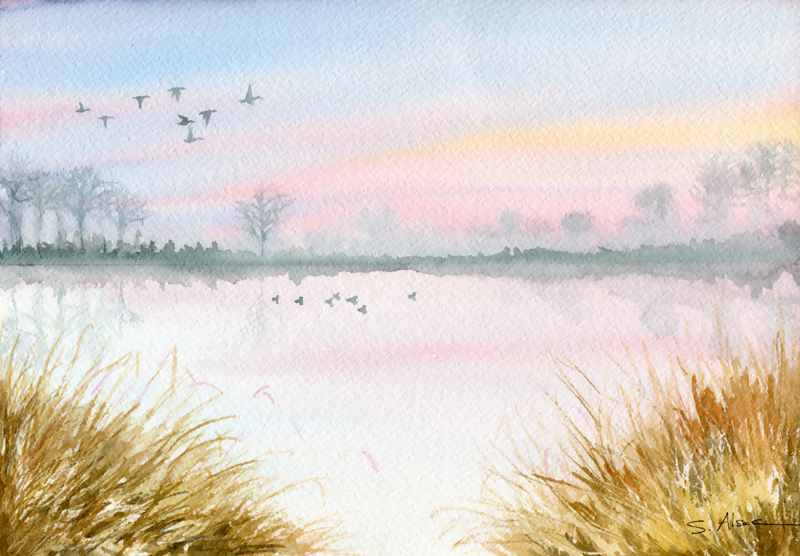 c'est la rentrée, le temps du menage et des rangements. On retrouve quelques vieilles choses oubliées. voici une petite aquarelle retrouvée au fond d'un tiroir, pour les huttiers ... "A l'aube" 18 x 26 cm cliquez pour zoomer Prix à débattre